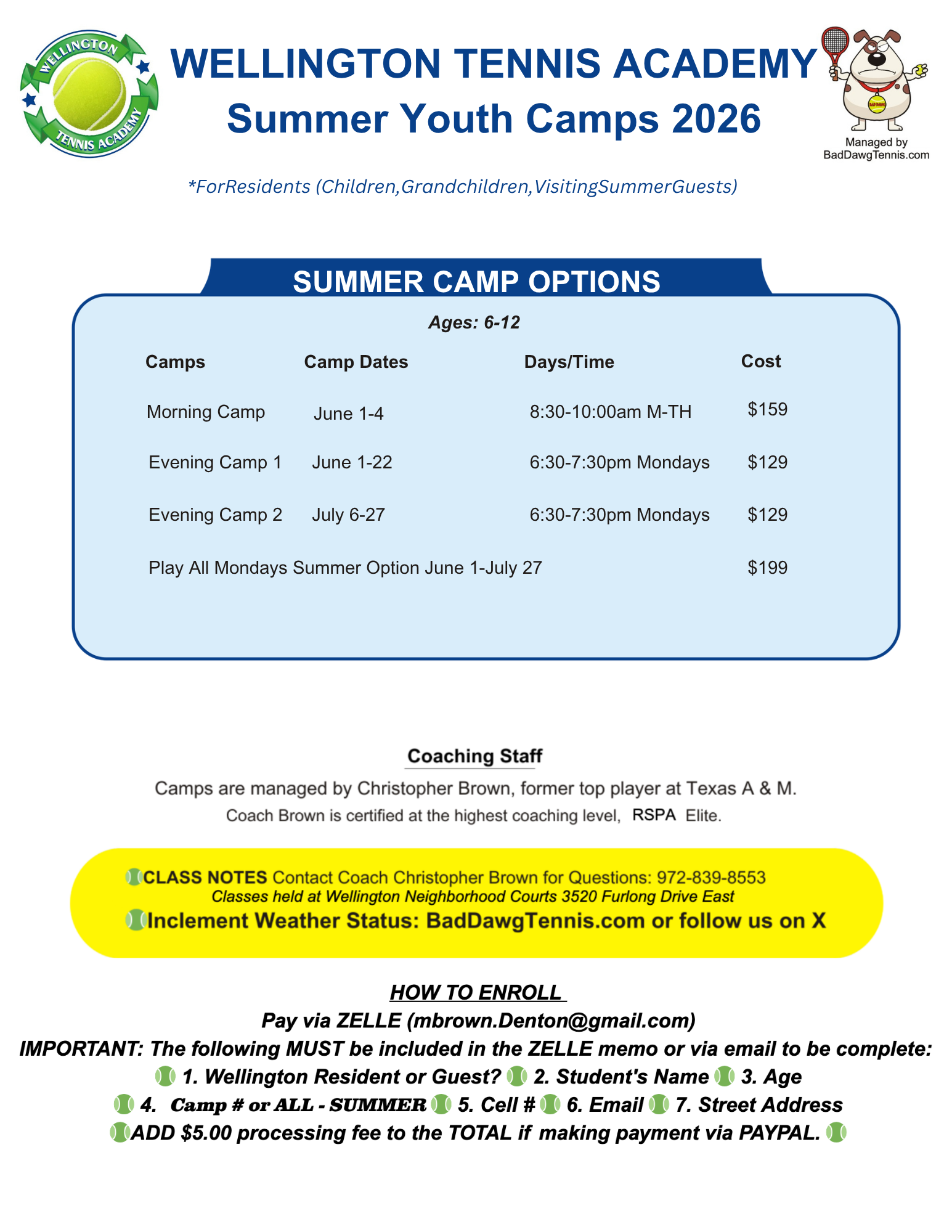 IMPORTANT: The following MUST be included in the ZELLE memo or via email to be complete: 🎾 1. Wellington Resident or Guest? 🎾 2. Student’s Name 🎾
